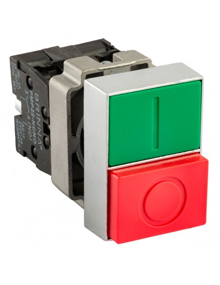 Pulsador marcha y parada Brinna. Fijación en panel 22mm, Doble comando verde rojo con contacto na + nc. Uso ideal para comercios, industrias y afines.